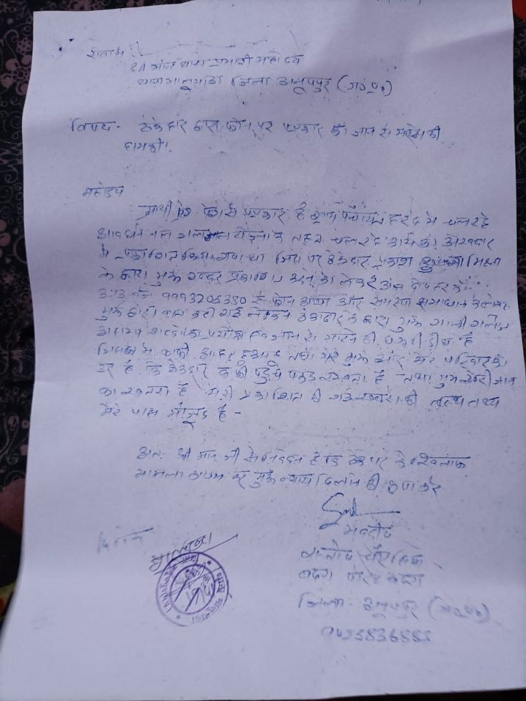 रिपोर्टर राजेश सिंह अनूपपुर। जिले के जमुना कोतमा क्षेत्र वरिष्ठ पत्रकार संतोष चौरसिया को 17 अप्रैल को लगभग 3 बजे के आसपास ठेकेदार प्रकाश चंद्र मिश्रा के द्वारा फोन लगाकर गाली-गलौज वह जान से मारने की धमकी देने का मामला प्रकाश में आया है जिसमे क्षेत्र के समस्त पत्रकारों द्वारा भालूमाडा थाना पहुंचकर शिकायत कर कार्यवाही की माग किया गया। यह है मामला हरद ग्राम पंचायत में लगभग 1 वर्ष हो जाने के बाद भी नल जल योजना का लाभ ग्रामीणों को नहीं मिल पाने के कारण वहां के ग्रामीणों के द्वारा व पत्रकारों को जानकारी दिया गया था जिसको प्राथमिकता से लेते हुए वरिष्ठ पत्रकार संतोष चौरसिया ने जन हितैषी खबर को ग्रामीणों के हित मे संज्ञान लेते हुए खबर को प्रकाशित किया था और साथ में जिले के कई अखबारों ने प्रमुखता से हरद ग्राम पंचायत के पानी की समस्या को लेकर खबर प्रकाशित किया गया। ठेकेदार ने दी जान से मारने की धमकी हरद नल जल योजना मे हुए गड़बड़ी का समाचार प्रकाशन होने से बौखलाए ठेकेदार ने आज दिनांक को फोन लगाकर पत्रकार संतोष चौरसिया को बोला कि तुम मुझे जानते नहीं हो मैं बिहार का रहने वाला हूं अगर तुमने खबर का प्रकाशन किया तो मैं तुम्हें जान से मार दूंगा और गाली गलौज करने लगा। कार्यवाही की मांग जिले के पत्रकार संगठनों ने लामबंद होकर जिला प्रशासन व पुलिस प्रशासन से ठेकेदार के विरुद्ध कार्यवाही की मांग कर रहे हैं 24 घंटे के अंदर अगर ठेकेदार के विरुद्ध कार्यवाही नहीं होती है तो पत्रकार संगठनों द्वारा लामबंद होकर आंदोलन करेंगे जिसकी नैतिक जिम्मेदारी जिला प्रशासन व पुलिस प्रशासन का होगा।