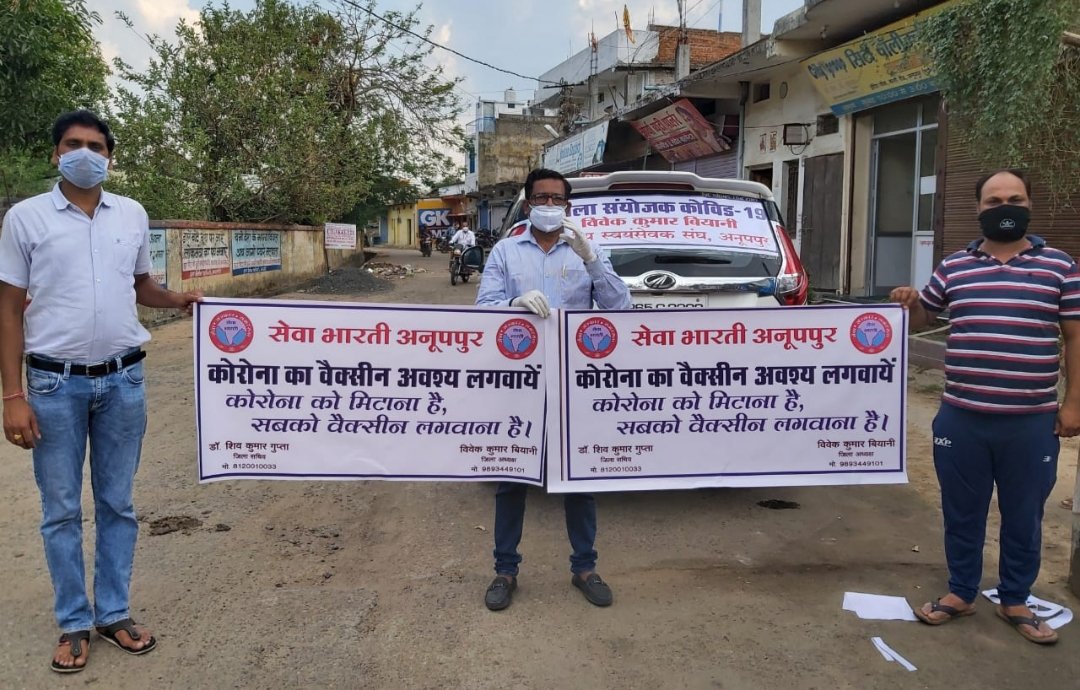 अनूपपुर। कोरोना वैक्सीन लगाने हेतु आम जनता ग्रामीण जनों को शहर के साथ गांव-गांव जाकर सेवा भारती जन जागरण के माध्यम से कोरोना वैक्सीनेशन के लिए लोगों को तैयार कर रही है। उन्हें इसके फायदे भी बता रही है। साथ ही ज्यादा से ज्यादा वैक्सीनेशन को लेकर जन जागरण अभियान का शुभारंभ सेवा भारती अनूपपुर के द्वारा किया गया। कोविड-19 गाइड लाइन के नियमों का पालन करते हुए आम जनों को घर में रहने की हिदायत दी जा रही है। साथ ही कोरोना की वैक्सीन के बारे में हो रही भ्रांतियों, अफवाहों को दूर करते हुए इसके उपयोग और आने वाले समय में इसके प्रभाव को समझाया जा रहा है। जिससे युवा वर्ग विशेष रुप से अपने आप के वैक्सीनेशन कराने हेतु प्रेरित हो रहा है और साथ ही अन्य लोगों को भी वैक्सीन लगवाने की प्रेरणा दे रहा है। जिसमें बड़े बुजुर्ग भी आगे बढ़कर वैक्सीनेशन पूरे परिवार के साथ कराने के लिए कोविड-19 सैंटरो में पहुंच रहे हैं। सेवा भारती अनूपपुर के जिला अध्यक्ष विवेक कुमार बियानी ने बताया कि जन जागरण के साथ-साथ इन इलाकों में लोगों की असुविधा और जरूरत के बारे में भी जानकारी ली जा रही है। उनके स्वास्थ्य के बारे में भी पूछा जा रहा है किल कोरोना अभियान के तहत हो रही कार्यवाही की भी जानकारी ली जा रही है।इस तरह जन जागरण के साथ-साथ समाज सेवा का कार्य भी सेवा भारती के सदस्यों द्वारा कराया जा रहा है। विपदा की इस घड़ी में आर एस एस के स्वयंसेवक जनसेवा के इस कार्य को बखूबी अंजाम दे रहे हैं। सेवा भारती के जिला अध्यक्ष विवेक कुमार बियानी के साथ जिला सचिव डॉक्टर शिव कुमार गुप्ता एवं कोषाध्यक्ष दिलीप शर्मा अन्य स्वयं सेवकों के साथ बारी बारी से जन जागरण का कार्य संपादित कर रहे हैं। कोरोना नियमों के तहत रैली और भीड़ की बजाए दो या तीन की संख्या में चरणबद्ध तरीके से वाहन का उपयोग करते हुए स्पीकर के द्वारा जन जागरण का कार्य किया जा रहा है।साथ ही लोगों को सलाह दी जा रही है कि मास्क का प्रयोग निरंतर करते रहें, हाथों को सैनिटाइजर और बार-बार साबुन से धोते रहें, सोशल डिस्टेंसिंग का पालन करें, गर्म पानी पिए,भाप बराबर लेते रहे साथ ही आयुष काढा कम से कम दो टाइम पिए और दो टाइम कम से कम नमक के पानी के गरारे करते रहें तो कोरोना कभी पास में नहीं आएगा।स्वयं करें, अपने परिवार को कराएं, अपने नाते रिश्तेदारों को बताएं जिससे कोरोना भारत से पूरी तरह सब के सहयोग से समाप्त हो सके।लोग पहले जैसी जिंदगी जीने लगे जरा सी लापरवाही नुकसानदायक हो सकती है इसका सभी ध्यान रखें। कोरोना वैक्सीन लगाने हेतु आम जनता ग्रामीण जनों को शहर के साथ गांव गांव जाकर सेवा भारती जन जागरण के माध्यम से कोरोना वैक्सीनेशन के लिए लोगों को तैयार कर रही है। उन्हें इसके फायदे भी बता रही है। सा