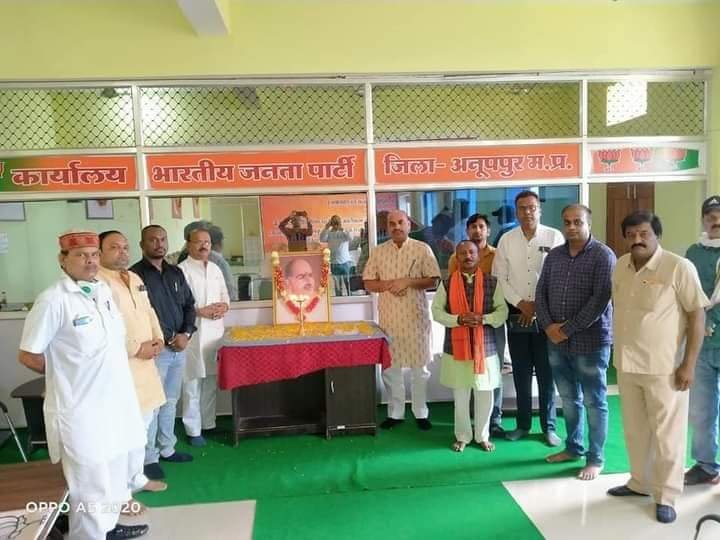 अनूपपुर। भारतीय जनता पार्टी अनूपपुर जिला कार्यालय में 23 जून 2021 को भारतीय जनसंघ के संस्थापक डॉ श्यामा प्रसाद मुखर्जी के बलिदान दिवस के अवसर पर उन्हें श्रद्धांजलि अर्पित करते हुए नमन किया गया भाजपा जिला अध्यक्ष बृजेश गौतम पूर्व विधायक दिलीप जायसवाल, पूर्व जिला अध्यक्ष रामदास पुरी, मंडल अध्यक्ष शिवरतन वर्मा, युवा मोर्चा के प्रदेश उपाध्यक्ष जितेंद्र सोनी, जिला कार्यालय मंत्री चंद्रिका द्विवेदी, नगर पालिका बिजुरी अध्यक्ष पुरुषोत्तम सिंह, नगर पालिका कोतमा उपाध्यक्ष प्रभात मिश्रा, महिला मोर्चा की गुड़िया रौतेल, पुष्पा पटेल तथा अन्य उपस्थित थे। कार्यकर्ताओं ने डॉक्टर श्यामा प्रसाद मुखर्जी के पुण्यतिथि के अवसर पर छायाचित्र पर श्रद्धांजलि अर्पित कर उन्हें नमन किया भारतीय जनता पार्टी के कार्यकर्ता और पदाधिकारियों ने जिले भर में डॉ श्यामा प्रसाद मुखर्जी को याद किया और उनके द्वारा देश समाज और संगठन के लिए किए गए कार्यों पर प्रकाश डाला। उनके पुण्यतिथि के अवसर पर विभिन्न मंडलों में सेवाकार्य के भी कार्यक्रम आयोजित किए गए उपरोक्त जानकारी भाजपा जिला मीडिया प्रभारी राजेश सिंह द्वारा दी गई।