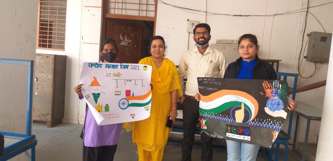 अनूपपुर। राज्य निर्वाचन आयोग के निर्देशों के अनुपालन में शासकीय तुलसी महाविद्यालय अनूपपुर ने गत दिवस विद्यार्थियों द्वारा मतदाता जागरूकता पर केन्द्रित चित्रकला प्रतियोगिता का आयोजन किया गया। कलेक्टर एवं जिला निर्वाचन अधिकारी (स्थानीय) सुश्री सोनिया मीना तथा जिला पंचायत के मुख्य कार्यपालन अधिकारी तथा नोडल अधिकारी सेन्स हर्षल पंचोली के मार्गदर्षन में महाविद्यालय के प्राचार्य श्री विक्रम सिंह बघेल के नेतृत्व में प्रोफेसर ज्ञानप्रकाश पाण्डेय, डाॅ. जी.के. संत, डाॅ. आकांक्षा राठौर का प्रतियोगिता आयोजित कराने में उल्लेखनीय योगदान रहा। मतदाता जागरूकता पर केन्द्रित चित्रकला प्रतियोगिता में साक्षी पाठक, आकांक्षा गुप्ता, आस्था, सेजल, प्रिया त्रिपाठी, शालिनी आदि महाविद्यालयीन छात्रों ने सहभागिता करते हुए फुल साईज ड्राईंग शीट में मतदाता जागरूकता का संदेश परिलक्षित करते हुए मतदाता जागरूकता के चित्र बनाए गए। चित्रों के साथ ही छात्राओं ने वोट द बेटर इंडिया, मेरा वोट मेरा भविष्य, सुन लो भाई, सुन लो बहना, सबसे कहना, वोट जरूर देना, बहकावे में कभी न आना, सोच समझकर बटन दबाना, सारे काम छोड़ दो, सबसे पहले वोट दो, मतदान अवष्य करें आदि स्लोगन के माध्यम से मतदाता जागरूकता का संदेष दिया गया।