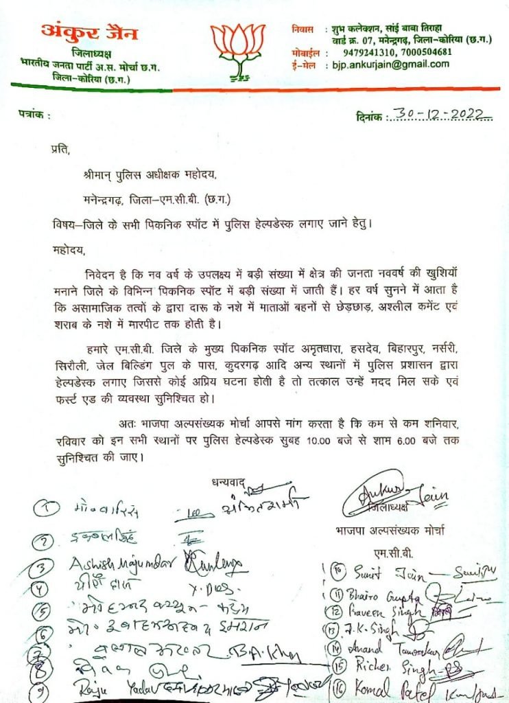 मनेन्द्रगढ़। भारतीय जनता पार्टी अल्पसंख्यक मोर्चा के द्वारा पुलिस अधीक्षक एमसीबी को ज्ञापन देकर मांग की गई है कि जिले के सभी पिकनिक स्पॉट में पुलिस हेल्प डेस्क लगाया जाए। नव वर्ष के उपलक्ष में बड़ी संख्या में क्षेत्र की जनता नववर्ष की खुशियां मनाने जिले के विभिन्न पिकनिक स्पॉट में बड़ी संख्या में जाती है। हर हर्ष सुनने में आता है कि असामाजिक तत्वों के द्वारा दारू के नशे में माताओं बहनों के साथ अभद्रता, छेड़छाड़, अश्लील कमेंट एवं शराब के नशे में मारपीट तक होती है। श्री जैन ने एमसीबी जिला के मुख्य पिकनिक स्पॉट अमृतधारा, हसदेव नदी, बिहारपुर, नर्सरी, सिरौली, जेल बिल्डिंग पुल के पास, कुदरगढ़ आदि अन्य स्थानों में पुलिस प्रशासन द्वारा हेल्पडेस्क लगाए जाने की मांग की है। जिससे कोई अप्रिय घटना ना हो और अगर होती है तो तत्काल उन्हें मदद मिल सके एवं फर्स्ट ऐड की व्यवस्था सुनिश्चित हो। श्री जैन ने कहा कि अगर हर दिन पिकनिक स्पॉट में हेल्प डेस्क नहीं लगाया जा सकता तो शनिवार और रविवार के दिन अनिवार्य रूप से हेल्पडेस्क सुबह 10 बजे से शाम 6 बजे तक लगाया जाना अति आवश्यक है, जिससे क्षेत्र की जनता बिना किसी भय के नव वर्ष में परिवार के साथ पिकनिक मनाने जा सके। ज्ञापन देने के द्वारान उप पुलिस अधीक्षक रूपेश डांडे ने आश्वासन दिया है कि इस जनहित के मुद्दे पर आवश्यक कार्यवाही तत्काल की जाएगी। ज्ञापन देने के दौरान भाजपा अल्पसंख्यक मोर्चा जिलाध्यक्ष अंकुर जैन, भाजपा अल्पसंख्यक मोर्चा प्रभारी जे.के. सिंह, भाजपा पार्षद दयाशंकर यादव, भाजपा प्रदेश महिला मोर्चा कार्यकारणी सदस्य प्रवीण सिंह, भाजपा मंडल उपाध्यक्ष विवेक अग्रवाल, भाजपा जिला कोषाध्यक्ष किसान मोर्चा आशीष मजूमदार, मछुआरा प्रकोष्ठ के जिला संयोजक आनंद ताम्रकार, युवा मोर्चा प्रदेश नीति अनुसंधान सदस्य से कोमल पटेल, अल्पसंख्यक मोर्चा मंडल अध्यक्ष वारिश खान, महामंत्री इकबाल सिंह, बलाल अख्तर, सुनील जैन, रिचेन सिंह, यीशे दास, मोहम्मद कय्यूम, गुरुप्रीत सिंह, इमरान अहमद, शकील अहमद, भैरो गुप्ता आदि उपस्थित रहे।
