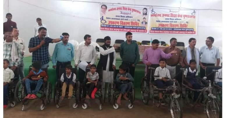 अनूपपुर। जनपद शिक्षा केन्द्र (सर्वशिक्षा अभियान) के तत्वावधान में 27 सितम्बर को स्वसहायता भवन पुष्पराजगढ़ में आयोजित उपकरण वितरण शिविर में विधानसभा पुष्पराजगढ़ के विधायक फुन्देलाल सिंह मार्को के मुख्य आतिथ्य एवं उपाध्यक्ष जनपद पंचायत पुष्पराजगढ़ संतोष पाण्डेय के विशिष्ट आतिथ्य में विकासखण्ड के चयनित 35 बच्चों को 39 उपकरण प्रदान किया गया। इनमे से 15 श्रवण यंत्र, 18 केलीपर, 04 ट्राय साइकिल, 05 व्हील चेयर, 01 सी.पी. चेयर, 02 रोलेटर वितरित किया गया। इस अवसर पर कार्यक्रम के मुख्य अतिथि विधायक फुन्देलाल सिंह मार्को द्वारा बच्चों को इसके नियमित उपयोग के साथ शिक्षा के मुख्य धारा से जुड़े रहने हेतु सलाह दी गई। साथ ही इन सभी बच्चों के साथ-साथ विकासखण्ड की शालाओं में अध्ययनरत सभी निःशक्त बच्चों को सामाजिक सुरक्षा अंतर्गत 600 रूपये प्रतिमाह की दर से पेंशन स्वीकृति हेतु मुख्य कार्यपालन अधिकारी जनपद पंचायत पुष्पराजगढ़ को निर्देशित किया गया। इस कार्यक्रम में जिला परियोजना समन्वयक (डी.पी.सी.) हेमंत खैरवाल, एस.डी.एम. पुष्पराजगढ़ ऋषि सिंघई, मुख्य कार्यपालन अधिकारी जनपद पंचायत पुष्पराजगढ़ मुद्रिका प्रसाद पटेल, विकासखण्ड शिक्षा अधिकारी नयनभान सिंह, समस्त बी.ए.सी. एवं जनशिक्षक उपस्थित रहे। कार्यक्रम का संचालन बी.आर.सी. समन्वयक हरप्रसाद तिवारी द्वारा किया गया।