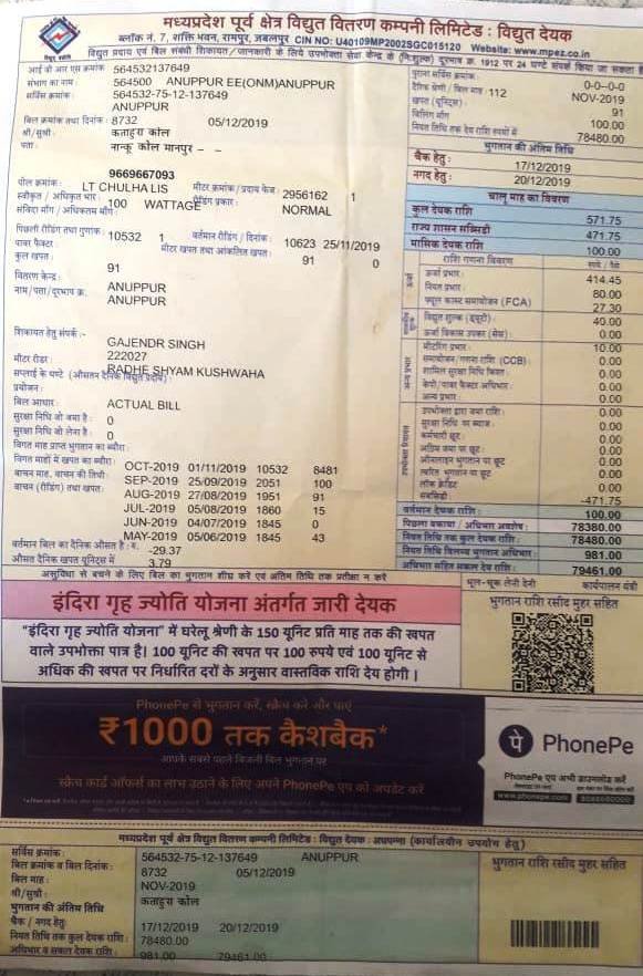 अनूपपुर। मध्यप्रदेश पूर्व क्षेत्र विद्युत वितरण कम्पनी के ठेकेदार सहित अधिकारियों-कर्मचारियों की मनमानी इस तरह हो गया है कि हितग्राहियों के बिजली के बिल में अनुमानित यूनिट रीडिंग लिखकर बिल का शुल्क भेज देते है, ऐसा ही एक मामला सामने आया है कि मानपुर गांव में रहने वाले एक गरीब आदिवासी मजदूर कताहुरा कोल के अक्टूबर माह के बिल 78,489 रूपए भेज दिये है जिससे वह बिल की राषि को देख हैरान रह गया। इस बिल को सुधरवाने के लिए उच्चाधिकारियों से निम्न अधिकारियों के दफ्तर का चक्कर काट रहा है। हितग्राही बताया है कि मैं एक गरीब मजूदर हूं और अपने झोपड़ी में दो बल्ब लगाया हूं तथा शाम 6 बजे से 10 बजे तक जलाता हूं, इसके बाद सायं को भोजन कर घर में सो जाते है,लेकिन आज दिनांक तक इसके पहले इतने राषि का बिल नहीं आया है। विद्युत विभाग के अधिकारियों के द्वारा चेतावनी दिया जा रहा है कि बिल की राषि 20 दिसम्बर तक 78,480 रुपये जमा करे, नहीं तो उसके झोपडी की बिजली काट दी जाएगी। अब बेचारा कताहुरा परेशान हाल दर-दर भटक रहा है। अधिकारियों-नेताओं से कह रहा है कि भैया मोरे ! मैं नहीं बिजली जलायो ….बिजली विभाग मोरे गले अस्सी हजार को बिल लटकायो, लेकिन कोई इस अबोध की चित्कार सुनने को तैयार नहीं। जिला मुख्यालय से लगे मानपुर गांव के कताहुरा कोल आत्मज नानकू को बिल क्रमांक 8732 दिनांक 5.12.2019 के द्वारा 20 दिसम्बर तक 75480 रुपये जमा करने का फरमान दिया गया है। उसे बतलाया गया है कि अन्य पिछले महीनों से उलट अक्टूबर मे उसकी झोपड़ी में 84,489 यूनिट की खपत हुई है। कताहुरा बिल लेकर यहाँ वहाँ भटक रहा है। जिसकी कोई सुनवाई नहीं हो रही।