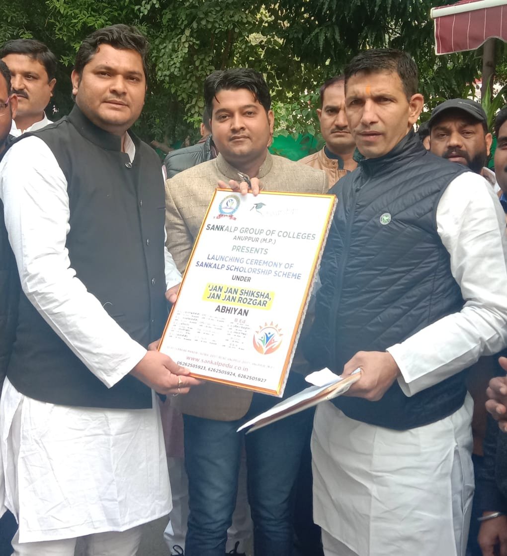 अनूपपुर। मुख्यालय स्थित संकल्प ग्रुप ऑफ जन-जन शिक्षा, जन-जन रोजगार को लेकर नित नई योजनाएं व क्रियाकलापो के माध्यम से छात्रों में सकरात्मक सोंच उत्पन्न कर रही है। इस विचार को लेकर संकल्प गु्रप ऑफ कालेज के डायरेक्टर अंकित शुक्ला ने भोपाल पहुॅचकर मध्यप्रदेश के उच्च शिक्षा मंत्री एवं खेल युवा कल्याण मंत्री जीतू पटवारी मुलाका करते हुए स्मृति चिन्ह भेंट की। जहां पर शिक्षा मंत्री ने संकल्प गु्रप के छात्रवृत्ति योजना की सराहना किये। इसके साथ ही प्रारंभ की गई जन-जन शिक्षा, जन-जन रोजगार छात्रवृत्ति योजना तथा हमेशा छात्रो के हितों के लिए तत्पर रहने के लिए उन्होने संकल्प दिया। श्री पटवारी ने इस नई सोच को लेकर संस्था को हमेशा इस तरीके के नए कार्याक्रमों को करने के लिए उत्साहित किये। उज्जवल भविष्य की कामना की महाविद्यालय संचालक द्वारा योजना का स्मृति चिन्ह मंत्री को सप्रेम भेट किया गया। इस अवसर पर अनूपपुर जिला कॉग्रेस कमेटी की कार्यकारी अध्यक्ष मयंक त्रिपाठी उपस्थित रहे।