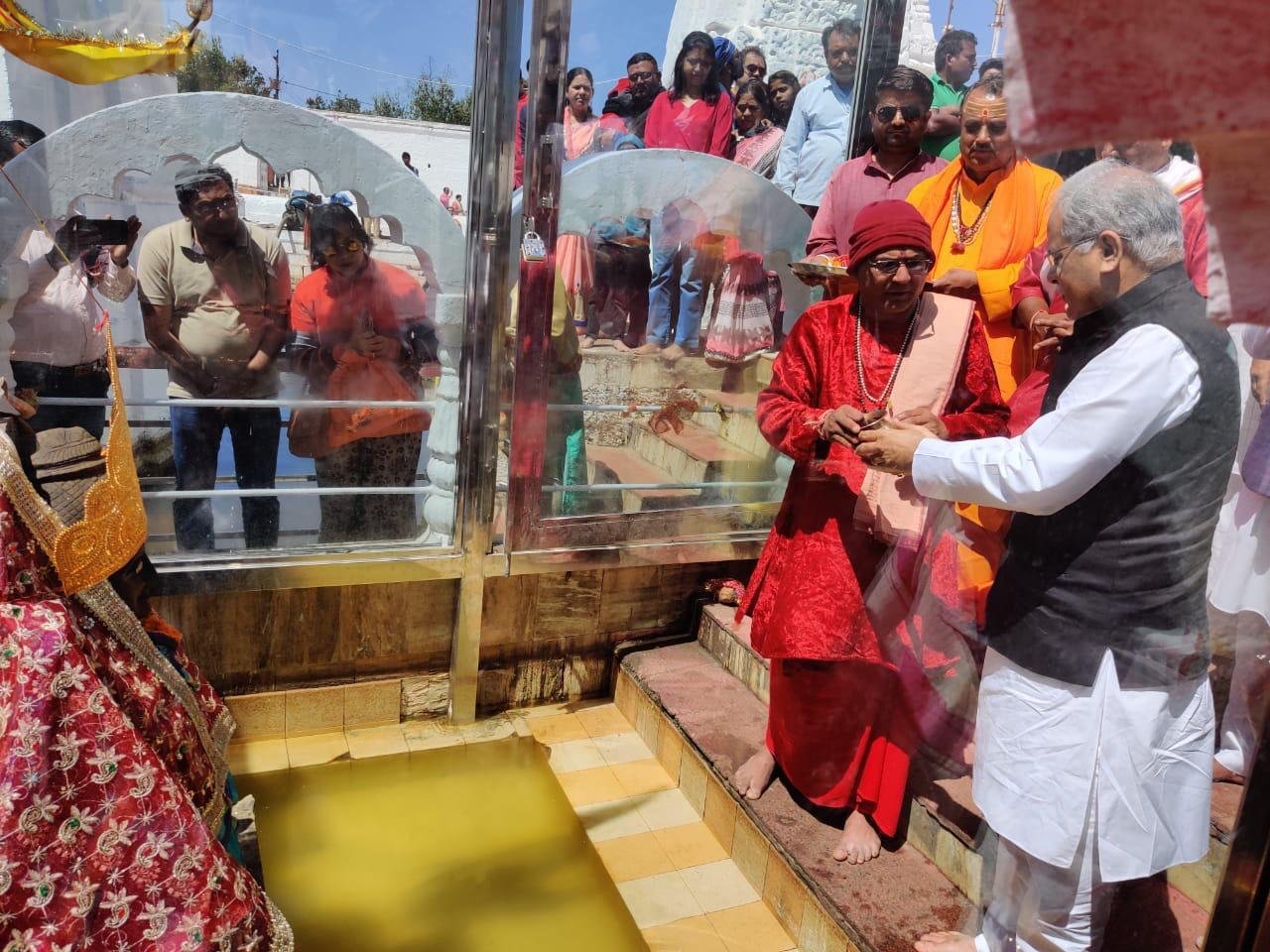 अनूपपुर। मुख्यमंत्री छत्तीसगढ़ भूपेश बघेल ने माँ नर्मदा उद्गम मंदिर अमरकंटक में माँ का दर्शन एवं पूजन कर क्षेत्र की सुख समृद्धि एवं खुशहाली की प्रार्थना की। श्री बघेल ने नर्मदा उद्गम मंदिर परिसर में स्थित रूद्रमंदिर में क्षेत्र की सुख समृद्धि हेतु रुद्राभिषेक किया। कलेक्टर चंद्रमोहन ठाकुर ने मुख्यमंत्री छत्तीसगढ़ बघेल को माँ नर्मदा उद्गम मंदिर ट्रस्ट द्वारा पैकेज किया हुआ नर्मदा उद्गम जल एवं भोग महाप्रसाद तथा नारियल लड्डू भेंट किया। श्री बघेल ने ट्रस्ट के इस प्रयास की सराहना की। मुख्यमंत्री बघेल ने अनूपपुर सहित प्रदेश के समस्त नागरिकों को होली की शुभकामनाएँ दी हैं। इस दौरान विधायक पुष्पराजगढ़ फुँदेलाल सिंह मार्को, डीआईजी शहडोल रेंज पीएस उईके, पुलिस अधीक्षक किरणलता केरकेट्टा सहित स्थानीय जनप्रतिनिधि, अन्य विभागीय अधिकारी कर्मचारी मीडिया प्रतिनिधि एवं आमजन उपस्थित रहे।