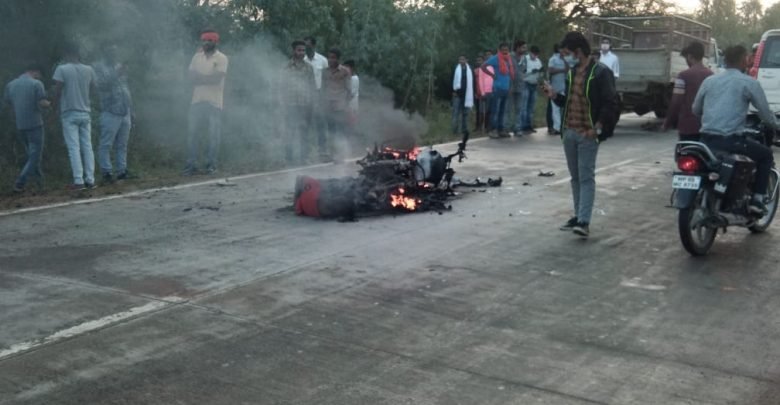 सड़क दुर्घटना में जिंदा जला मोटरसाइकिल सवार राजेश सिंह बाइक में आग लगने के बाद, एक युवक जिंदा जला मौत दूसरा जख्मी अनूपपुर ।जिला मुख्यालय से 4 किलोमीटर दूर जैतहरी मार्ग में एक मोटरसाइकिल खड़ी पिकअप से जा टकराई और बाइक में आग लग गई जिससे एक युवक की आग की चपेट में आने से वही मौत हो गई ,दूसरा गंभीर रूप से झुलस गया जिसे जिला अस्पताल लाया गया है। मृतक युवक का नाम आयुष्मान पिता रजनीश विश्वकर्मा 15 वर्ष और घायल युवक का नाम आशीष पिता रामप्रसाद विश्वकर्मा 20 वर्ष निवासी ग्राम सेदुरी थाना कोतवाली अनूपपुर है । यह घटना शाम करीब 5:30 बजे की है दोनों युवक बाइक से अनूपपुर की तरफ आ रहे थे जिस पिकअप से ठोकर लगी के चालक गाड़ी छोड़कर भाग निकले पिकअप बिना नंबर की बताई गई बताया गया मृतक बाइक चला रहा था और आशीष पीछे बैठा हुआ था। इस घटना से नाराज लोग खड़ी पिकअप के साथ तोड़फोड़ भी कर दी थी पुलिस के पहुंचने से नाराज भीड़ को तुरंत तितर-बितर किया गया जिससे अप्रिय माहौल निर्मित नहीं हो पाया। बताया गया करीब आधे घंटे तक बाइक के साथ मृतक का शरीर भी जलता हुआ वहीं पड़ा रहा, बाद में परिजनों द्वारा घायल आशीष को एक पिकअप के द्वारा जिला अस्पताल पहुंचाया गया, जहां उसकी हालत नाजुक बनी हुई है वह करीब 70% जल गया है। बताया गया बाइक जैसे ही पिक अप के पिछले हिस्से टकराई बाइक की टंकी फट गई और उसमें आग भड़क उठी और बाइक में बैठे दोनों युवक आग की चपेट में आ गए।