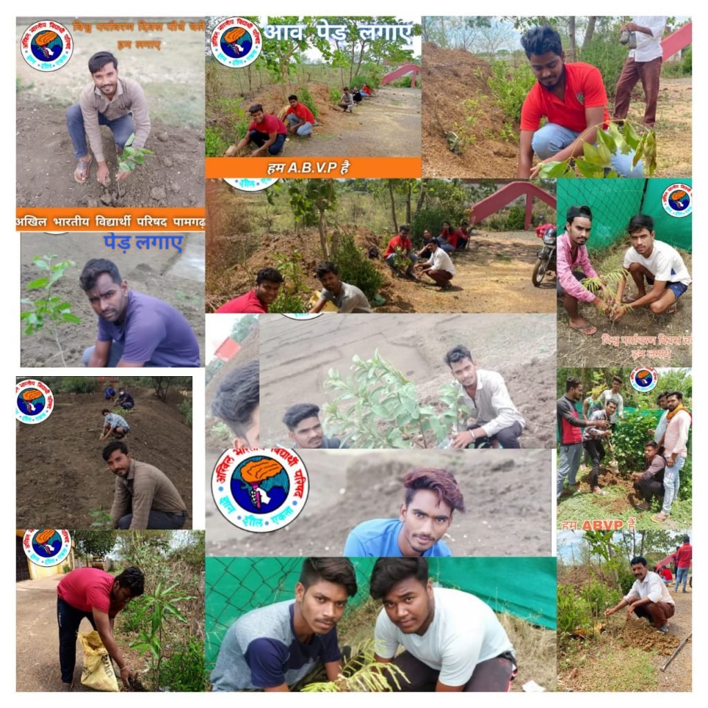 अखिल भारतीय विद्यार्थी परिषद छत्तीसगढ़ द्वारा विश्व पर्यावरण दिवस के अवसर पर आपसे एक आग्रह करता है कि इस दिन पर अपने घर मे पेड़ अवश्य लगाएं और पर्यावरण और प्रकृति के के अपने कर्ज अवश्य चुकाएं हमारा एक छोटा सा अभियान आपके सहयोग से सफल हो सकता है और आने वाले पीढ़ी के लिए हम एक वृक्ष दे पाएंगे इसी उद्देश्य से इस संकल्प को पूरा करने में हमारा सहयोग प्रदान करें… प्रमुख रूप से प्रदेश कार्यकारिणी सदस्य मनोबल सिंह जाहिरे जी पामगढ़ नगर मंत्री नगर अध्यक्ष अकाश गुप्ता जी अखिल भारतीय विद्यार्थी परिषद के कार्यकर्ता विश्वनाथ जाहिर है अखिलेश भाई श्रीजन सोनी भूपेंद्र दर्वेश सुमन लहरें अनुज कुटे गेंदराम ज्योति केवट रुझुन गुप्ता अमीत अनंत प्रांतिक गुप्ता विकास कश्यप श्रेयांश यादव सभी ने पेड़ लगाए