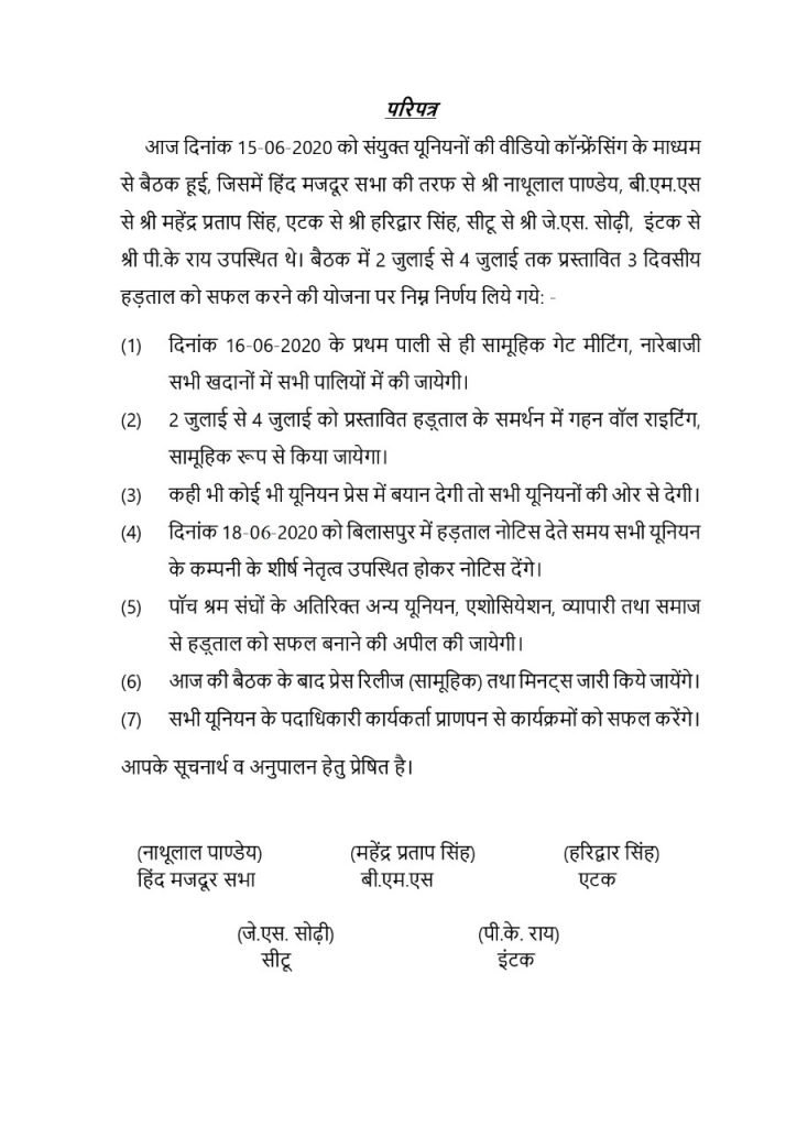 &संयुक्त ट्रेड यूनियन के द्वारा 18 जून 2020 को मनाया जायेगा विरोध दिवस 2 से 4 जुलाई को कोल इंडिया में होगी तीन दिवसीय हड़ताल संतोष चौरसिया अनूपपुर कोल केंद्रीय श्रम संगठनों एचएमएस, बीएमएस, एटक, सीटू एवं इंटक यूनियन की दिनांक 14 जून 2020 को संपन्न हुई फेडरेशन स्तर की बैठक मेँ भारत सरकार के उद्योग विरोधी एवं मजदूर विरोधी फैसलों कोयला उद्योग का निजीकरण, कामर्शियल माइनिंग, निजी क्षेत्रों को कोल ब्लॉक आवंटन, सीएमपीडीआई को कोल इंडिया से अलग करने इत्यादि के खिलाफ 18 जून को देशव्यापी विरोध दिवस मनाने एवं 2 जुलाई से 4 जुलाई तक कोल इंडिया में तीन दिवसीय हड़ताल करने का निर्णय लिया गया है इसी कड़ी में एचएमएस, एटक, बीएमएस, इंटक, सीटू यूनियन की एसईसीएल स्तर की बैठक ज़ूम एप्प के जरिए दिनांक 15 जून 2020 को संपन्न हुई। बैठक मेँ एचएमएस के महामंत्री श्री नाथूलाल पांडेय, बीएमएस SECL के प्रभारी श्री महेंद्र प्रताप सिंह, एटक के महामंत्री काo हरिद्वार सिंह, सीटू के महामंत्री काo जे.एस.सोढ़ी, इंटक के महामंत्री श्री पीoकेoराय उपस्थित रहे। बैठक में 2 जुलाई से 4 जुलाई तक प्रस्तावित तीन दिवसीय हड़ताल को सफल बनाने की योजना पर निर्णय लिए गए | 16 जून के प्रथम पाली से ही गेट मीटिंग, नारेबाजी, सभी खदानों में सभी पालियो में की जाएगी | हड़ताल के समर्थन में वाल राइटिंग किया जायेगा 18 जून 2020 को एसईसीएल मुख्यालय बिलासपुर में पांचो यूनियन के शीर्ष नेताओ की उपस्थिति में हड़ताल नोटिस दिया जायेगा प्रमुख मांगे - 1) कोयला खानों का निजीकरण रोकना| 2) वाणिज्यिक खनन हेतु प्रस्तावित नीलामी रोकना| 3) सीआईएल से सीएमपीडीआईएल को अलग करने के प्रस्ताव को वापस लेना| 4) ठेकेदारी श्रमिकों को एचपीसी मजदूरी का भुगतान सुनिश्चित करना 5) एनसीडब्ल्यूए-6 के अनुसार 9.4.0 के तहत मेडिकल अनफिट कामगारों के आश्रित को नौकरी दिया जाये एचएमएस, एटक, बीएमएस, इंटक, सीटू यूनियन के शीर्ष नेताओं ने कोयला मजदूरों से भी आहवान किया है कि 18 जून के विरोध दिवस में बढ़ चढ़ कर हिस्सा लेवे एवं कोल इंडिया को बचाने के लिए 2 जुलाई से 4 जुलाई तक प्रस्तावित तीन दिवसीय हड़ताल को सफल बनावेnbsp;