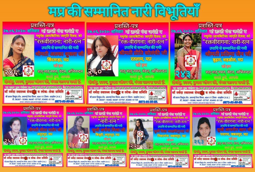 अनूपपुर। मानव-जीवन का मूल सिद्धांत है कि किसी भी जरूरतमंद एवं असहाय की किसी-न-किसी रुप में, सेवा-सहयोग करना. जैसे- रक्तदान करना (विशेषकर अपने घर- परिवार- समाज के व्यक्ति के लिये), रोगी के लिये औषधि- खानपान की व्यवस्था, भूखे को अन्न, प्यासे को जल, वस्त्रहीन को वस्त्र, अशिक्षित को शिक्षा, निराश्रयी को आश्रय एवं जीविकाहीन को जीविकोपार्जन में सहयोग-साथ देना इत्यादि ही अत्यन्त उत्तम सेवा-सहयोग होता है. जो व्यक्ति नि:स्वार्थ भाव से दूसरों के हित में संलग्न रहते हैं, वही सच्ची सेवा-सहयोग होता है, ऐसा करने पर जीवन में सच्चे सुख का अनुभव होता है. आप भी इसे अपने कार्य रुप में परिणीत करेंगे तो सच्चे सुख के आनन्द में विभोर हो उठेंगे.”इन्हीं भावनाओं को चरितार्थ करते, हमारे देश की महान विभूतियों, मातृशक्तियों से प्रत्यक्ष- अप्रत्यक्ष संपर्क,सहयोग, सानिध्य प्राप्त कर सम्मान किया गया । मां नर्मदा स्वास्थ्य सेवा व लोक-सेवा समिति द्वारा विगत दिनों मां ताप्ती गंगा जयंती व मधुमेह (डायबिटीज) जागृति दिवस के अवसर पर 29 विभूतियों का सम्मान किया गया है। सम्मानित होने वाली विभूतियों में- मप्र की सम्मानित विभूतियाँ रक्त-भामाशाह, समाज-रत्न प्रकाश ओचानी- शहडोल, पत्रकार-रत्न, रक्तवीर मुकेश मिश्रा- अनूपपुर, संजय चौधरी- बुढ़ार-शहडोल, सम्यक जैन- बुढ़ार-शहडोल, राहुल तिवारी-जबलपुर व जितेन्द्र कुमार पाण्डेय- कटंगा-जबलपुर मप्र की सम्मानित नारी विभूतियाँ श्रीमती अलका शुक्ला- छिंदवाड़ा, श्रीमती प्रीति सोलंकी-रतलाम, श्रीमती प्रतिमा जैन-बुढ़ार-शहडोल, सुश्री अर्चना मिश्रा- बिजुरी-अनूपपुर, सुश्री दिशा अग्रहरी- निवारगंज-जबलपुर, श्रीमती सीता राठौर-अनूपपुर व सुश्री आफरीन खान- पनागर-जबलपुर, छग की सम्मानित विभूतियाँ जितेन्द्र कारिया-दुर्ग, देहदानी (दधीचि) सुश्री टिलेश्वरी साहू- पुरी- धमतरी, रूपेश शुक्ला-बेलटुकरी-बिलासपुर व रोशन लाल साहू- लिंगियाडीह-बिलासपुर. राजस्थान की सम्मानित विभूतियाँ रक्तवीर-भामाशाह: समाज-रत्न रमेश चन्द्र मेहता- उदयपुर, पर्यावरण-सखी: नारी-रत्न सुश्री दिव्या कुमारी जैन- कोटा, श्रीमती सुनीता शर्मा- बूंदी व सुश्री डॉ.शिप्रा चैनानी- उदयपुर कर्नाटक की सम्मानित विभूतियाँ चिरंजीलाल कुमावत- मैसुरू, देवेन्द्र परिहारिया- बोगादी- मैसुरू, गौपुत्र: समाज-रत्न प्रकाश राठौड़- दोरनडी(सोजत-पाली), राजस्थान / बैंगलोर व विकाश राठौड़ (मोदी)- सोजत- पाली, राजस्थान / मैसूरू उत्तरप्रदेश, उत्तराखण्ड, बिहार व गुजरात की सम्मानित विभूतियाँ श्रीमती डॉ.ममता स्वर्णकार (रक्तकर्णिका)- उरई, जालौन, उप्र, देहदानी (दधीचि), जनाब मोहम्मद आरिफ (अली भाई)- रुद्रपुर-उधमसिंहनगर, उत्तराखण्ड, पत्रकार-रत्न निशांत राज- मोतिहारी, बिहार व धीरज कुमा