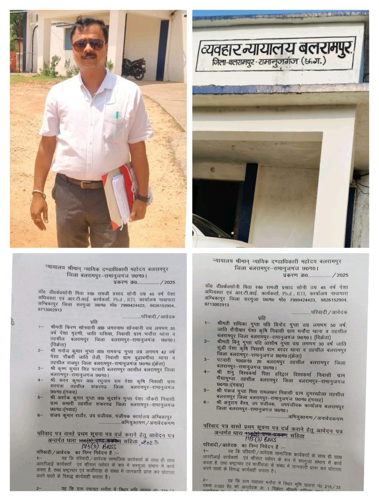 अंबिकापुर। मामला कूट रचित दस्तावेजों के आधार पर ग्राम भनौरा तहसील बलरामपुर में स्थित 143 एकड़ भूमि का विक्रय पत्र टुकड़े-टुकड़े कर अलग-अलग क्रेता विक्रेता के द्वारा निष्पादित करने के संबंध में डॉक्टर डी. के. सोनी अधिवक्ता एवं आईटीआई कार्यकर्ता द्वारा 5 फरवरी 2025 को धारा 175 भारतीय नागरिक सुरक्षा संहिता 2023 के तहत मय […]